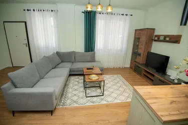 Organizohet ne 2 dhoma ndenje 2 tualete 1 dhome ndenje sebashku me kuzhinen. Apartamenti ka oborr me dere private , ku mund te shfrytezohet dhe si post parkimi.