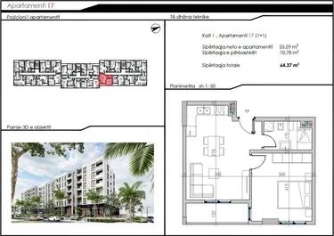 📍Apartamenti me siperfaqe te brendshme 53.59 m2 dhe sip.totale 64.37 m2 organizohet ne salle ndenje + kuzhine, 1 dhome gjumi, 1 tualet.